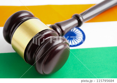 India, Legal, justice and agreement, wooden court gavel on flag.