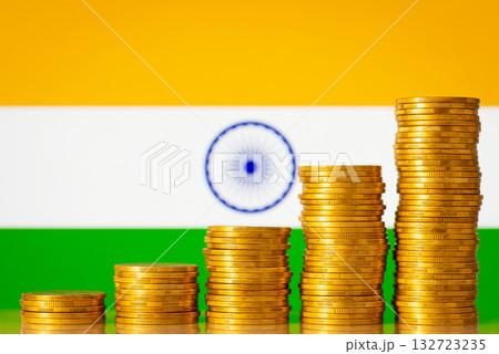 Stacks of golden coins forming uprising graph in front of India flag. Concept of development of Indian financial system