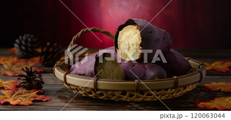焼きたて熱々の焼き芋( 鳴門金時 )秋の味覚 木目バック