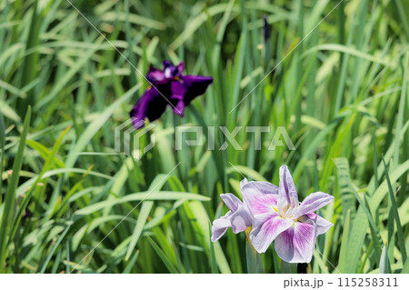 初夏の公園 綺麗に咲く花菖蒲の風景