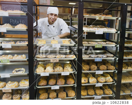 Baker standing behind trays of baked goods