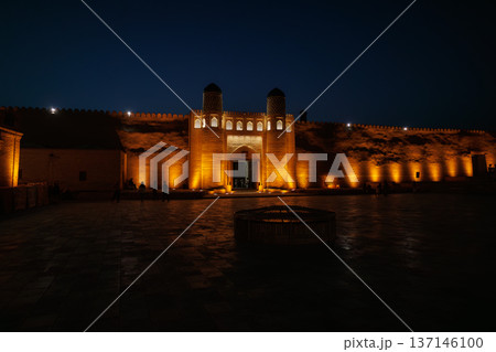 ウズベキスタン、ヒヴァのイチャン・カラの夜景