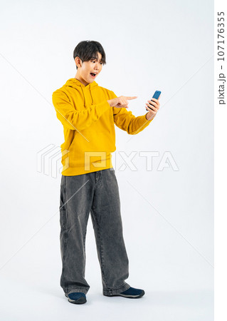 スマホを見て驚く少年 背景透過切り抜きPNG