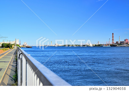 日本の横浜都市景観 貿易拠点の大黒ふ頭や川崎・扇島などを望む。手前を行くのはSPRING HONOR