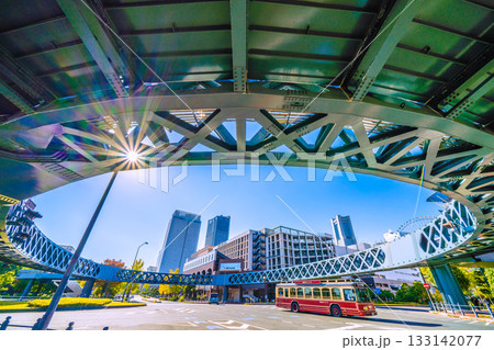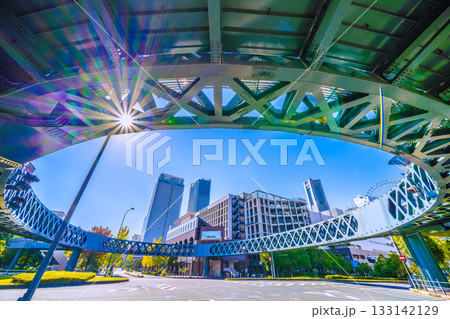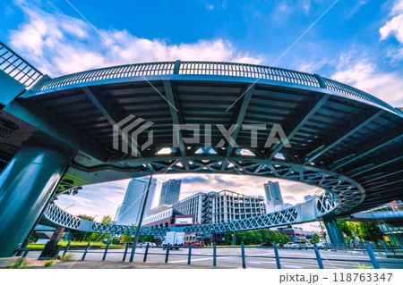 日本の横浜都市景観 歩道橋のある街。みなとみらいの新港サークルウォークや新港中央広場のエスカレーター