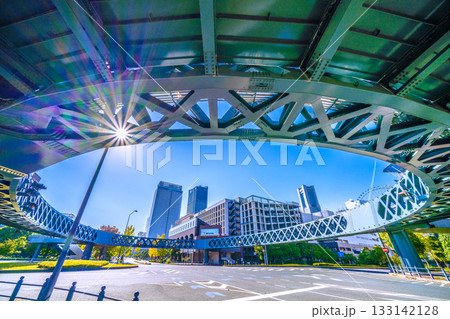 日本の横浜都市景観 歩道橋のある街…新港サークルウォークや横浜ランドマークタワー、あかいくつ…