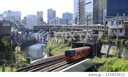 東京・御茶ノ水の聖橋の下で見た画面奥からJR総武線、JR中央線、東京メトロ丸ノ内線の3路線立体交差