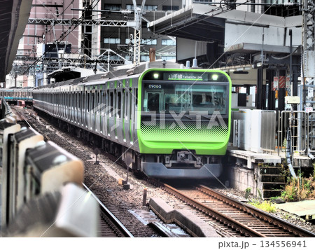 山手線 水彩画 ペン画 イラスト ホームに停車する電車 (E235系)