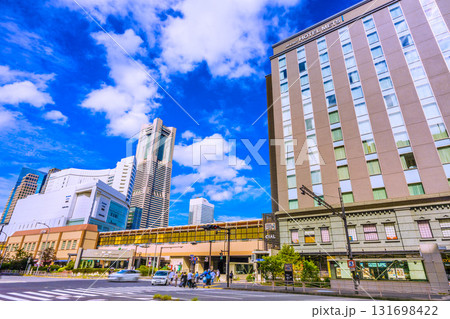 日本の横浜都市景観 桜木町駅前複合ビル・JR東日本ホテルメッツ横浜桜木町などを望む。左は桜木町駅