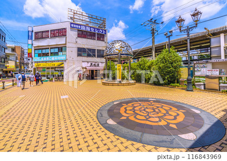 日本の東京都市景観 7月。町田市のJR横浜線 成瀬駅や電車、成瀬駅南口バラの広場などを望む=21日