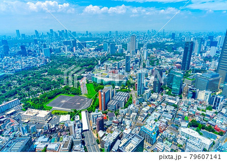 日本の東京都市景観 新国立競技場や国立競技場駅などを望む