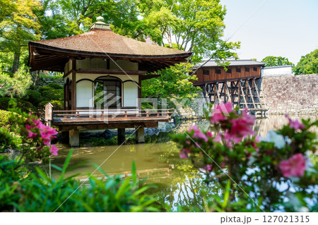夏の和歌山城・紅葉渓庭園、池に浮かぶように建つ鳶魚閣。