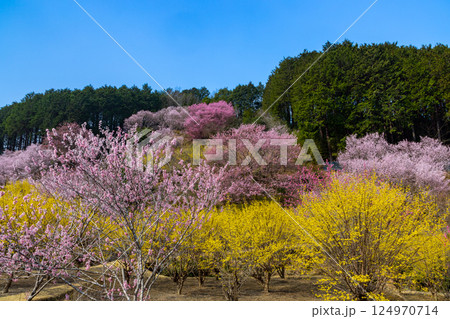 埼玉県秩父郡東秩父村大内沢 早春の里山の斜面に早咲き桜とサンシュユが咲く大内沢花桃の郷
