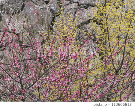 早春の里山に咲く紅梅と山茱萸