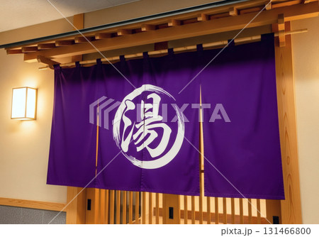 温泉や銭湯の入り口にかかる紫の暖簾と大きな湯の文字