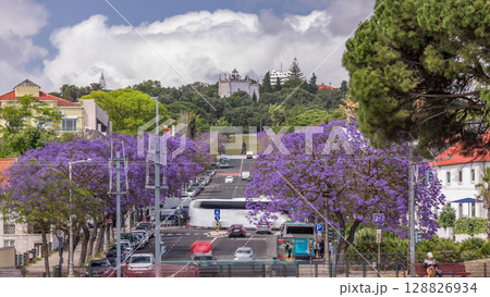 Beautiful Blue Jacaranda blooming in Lisbon street with monument in Jardim Ducla Soares timelapse. Portugal