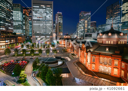 日本 東京都千代田区丸の内のKITTEガーデンから見える赤レンガ作りの東京駅舎と高層ビル群の夜景