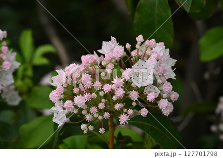 カルミヤ 別名:アメリカシャクナゲ 学名:Kalmia latifolia、春に撮影(日本)