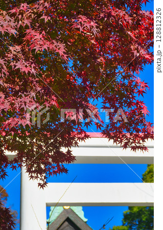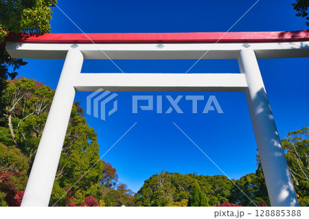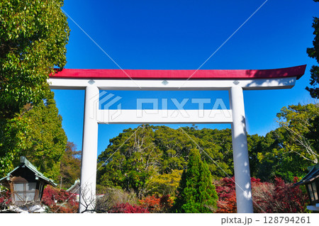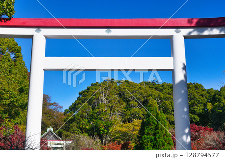 青空にはえる鎌倉宮の美しい鳥居と紅葉(神奈川県鎌倉市)