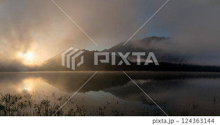 foggy cold sunrise on alpine lake Barmsee
