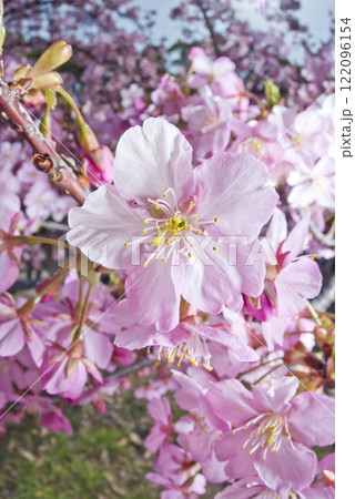 早春の公園に咲く早咲きのカワヅザクラのピンク色の花