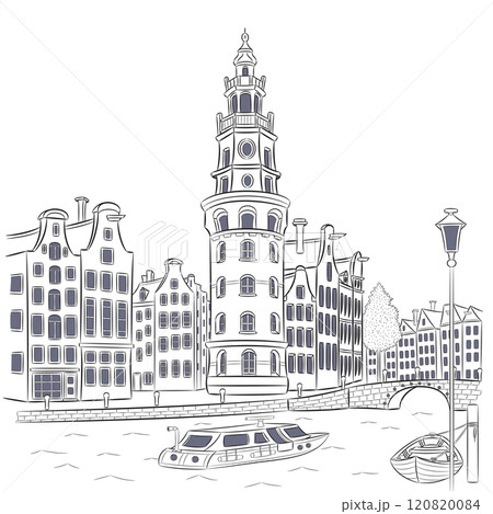Black and white drawing of Amsterdam canal and Montelbaanstoren tower, Netherlands