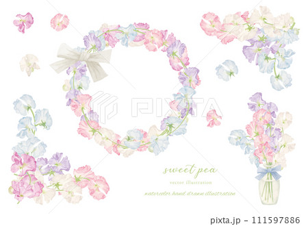 水彩手書きのスイートピーのフレームイラスト素材セット