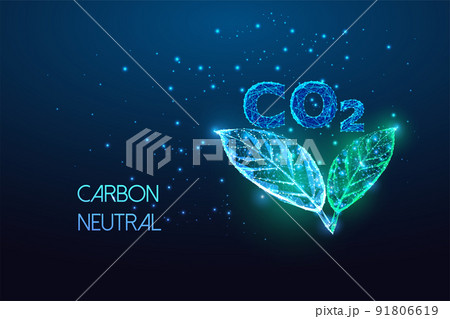 Concept of carbon neutral, net zero emission with CO2 and green leaves in futuristic glowing on blue