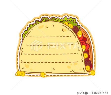 Cartoon Mexican taco with a crispy shell, filled with seasoned meat, fresh lettuce, tomatoes, and shredded cheese. Isolated vector traditional tex mex food, Hispanic cuisine snack, dish of Mexico