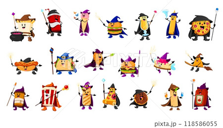 Cartoon Halloween fast food mage, wizard and witch characters. Vector french fries, cola or coffee cups, ice cream and burger. Cocktail, mustard and ketchup bottles, pizza, hotdog with popcorn, donut