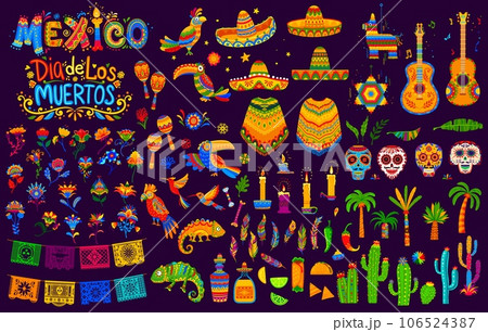 Mexican holiday and festival objects. Sombrero and guitars, maracas and toucans, parrots and feathers, cactus and candles, tex mex food, calavera sugar skulls and palms, papel picado flags and tequila