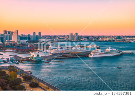 日本の横浜都市景観3隻日本の豪華客船が横浜港に集結。にっぽん丸や飛鳥Ⅱ、三井オーシャンフジなどを望む
