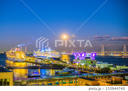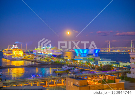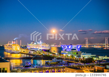 日本の横浜都市景観新景3隻コラボ。師走の満月。大さん橋の飛鳥Ⅱやパシフィック・ワ号、オーシャンフジ…