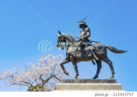桜の青葉城址と伊達政宗騎馬像