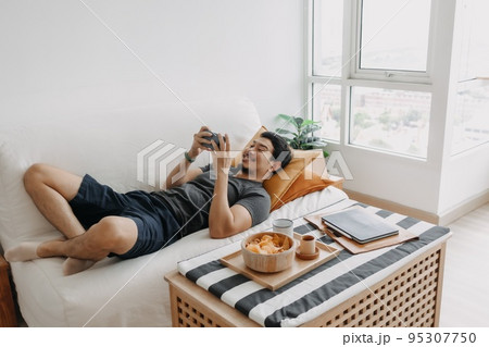 Lazy happy man playing mobile game while he should have work from home.
