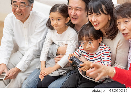 明るいリビングのソファに座りテレビゲームを楽しむ仲良し家族六人将来はプロゲーマー