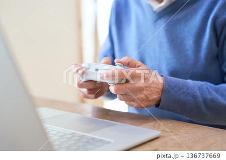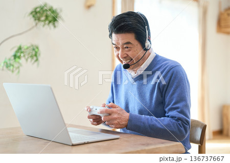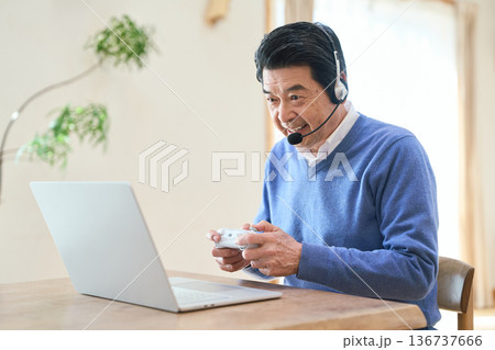PCゲームを楽しむアジア人シニア男性