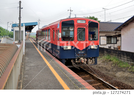 浦田駅に到着する水島臨海鉄道のMRT300形50周年記念塗装色です。