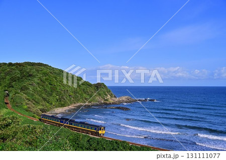 【島根県】快晴の折居海岸と特急スーパーまつかぜ