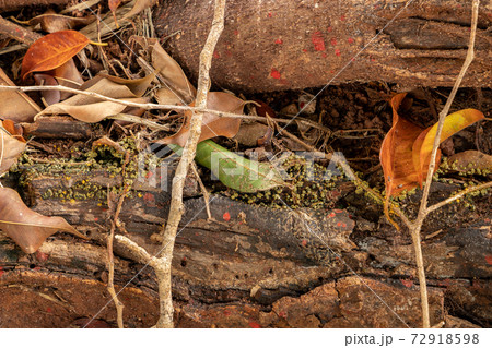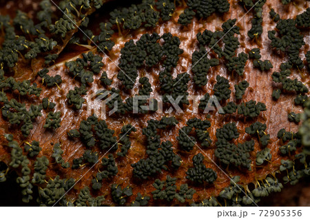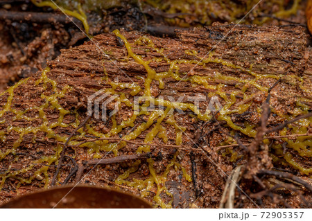朽木表面にモジホコリ科と思われる赤茶(赤さび色)の変形菌(粘菌)群体(自然環境下ストロボマクロ撮影)