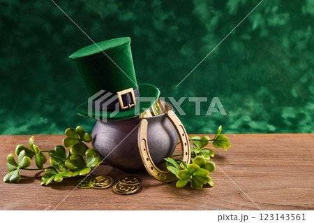 St Patricks day and March 17 frame with gift, leprechaun hat and clover leaves on green background. View from above.