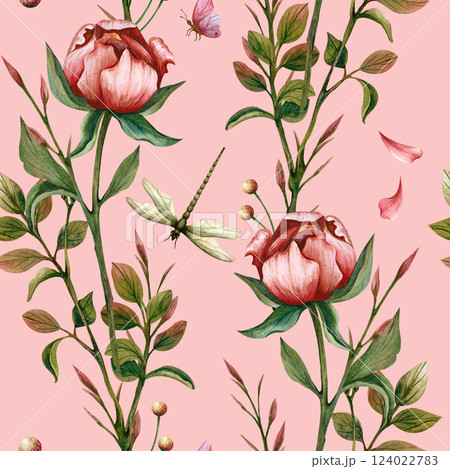Seamless pattern with peony, leaves, dragonfly and butterfly. Isolated Watercolor illustration on pink background. Hand drawn insects and foliage for packaging paper, textile, stationery, scrapbook