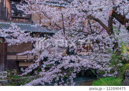 古都の春の京都市東山祇園白川のしっとりと咲く桜を撮影