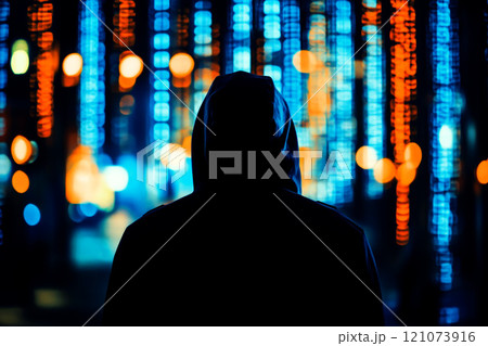 Abstract image of unrecognizable hacker cyber criminal in hood with dark space and matrix face on digital background. Security system cyber attack