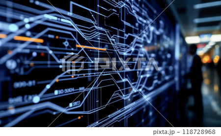 Modern electronic circuit and binary code on blue glowing background. Digital nano technologies concept.