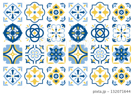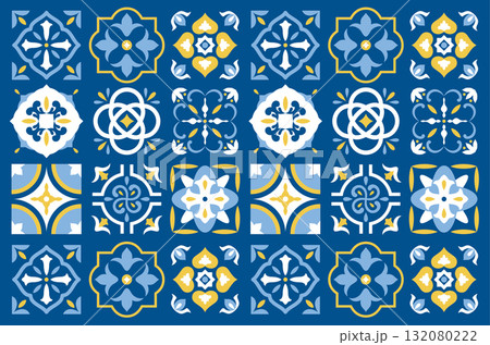Mediterranean floral seamless pattern of blue red and yellow tiles. Ethnic mosaic design of Portuguese, Italian, Spanish decorative motifs. Ornament for home textile or ceramic. Vector illustration