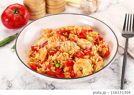 Traditional spanish paella with seafood and vegetables for culinary exploration. Typical cuisine of Spain. Valencian cuisine. Stage of cooking paella. Ingredients for paella