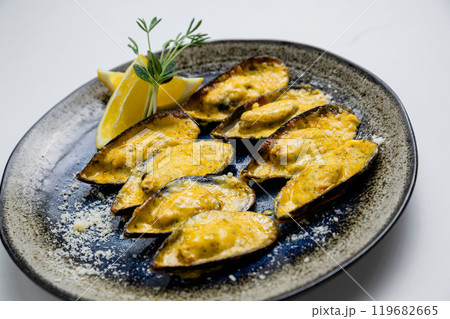 Baked mussels with cheese and lemon wedges, perfect seafood appetizer with a gourmet touch