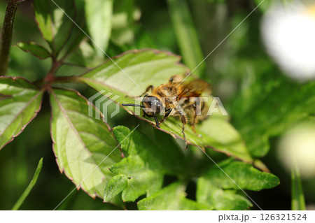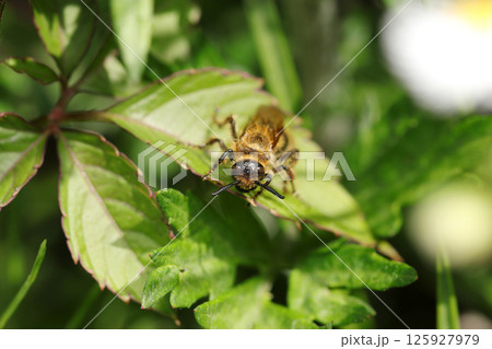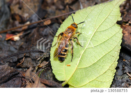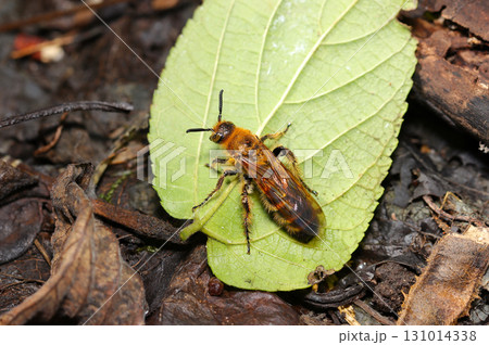 若葉の上で休憩する美しい黄金色の毛に覆われるキンケハラナガツチバチ成虫(自然環境下マクロ撮影)