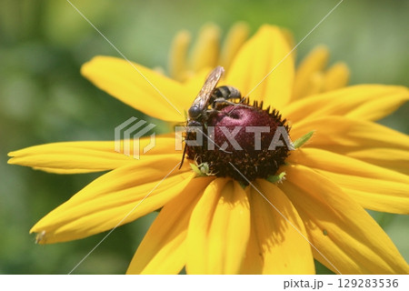 初夏の公園に咲くノコギリソウの蜜を吸うハラナガツチバチ